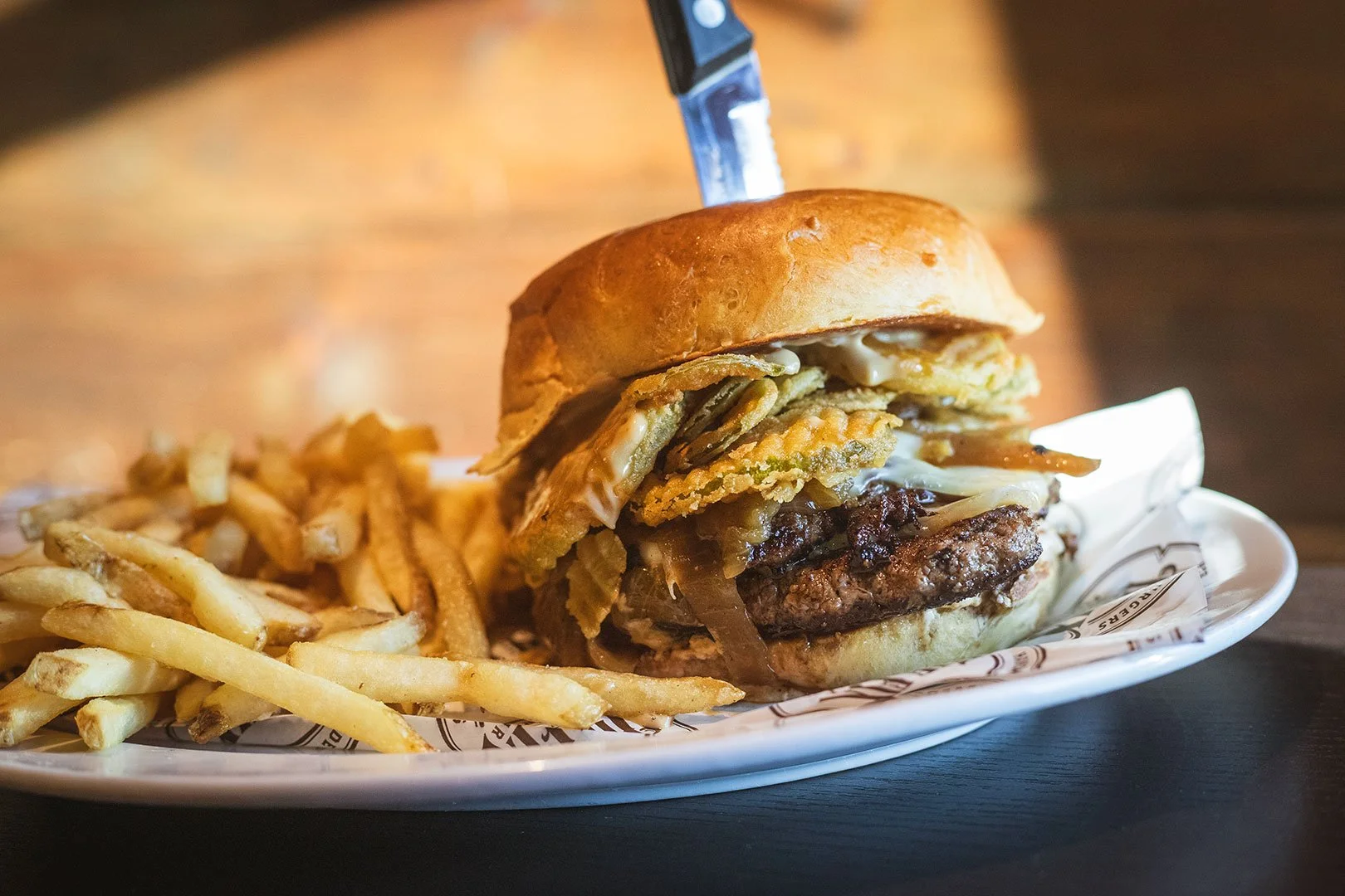Swiss, pimento cheese, bacon, fried pickle, fried jalapeño, caramelized onion, A1 aioli, brioche / 24