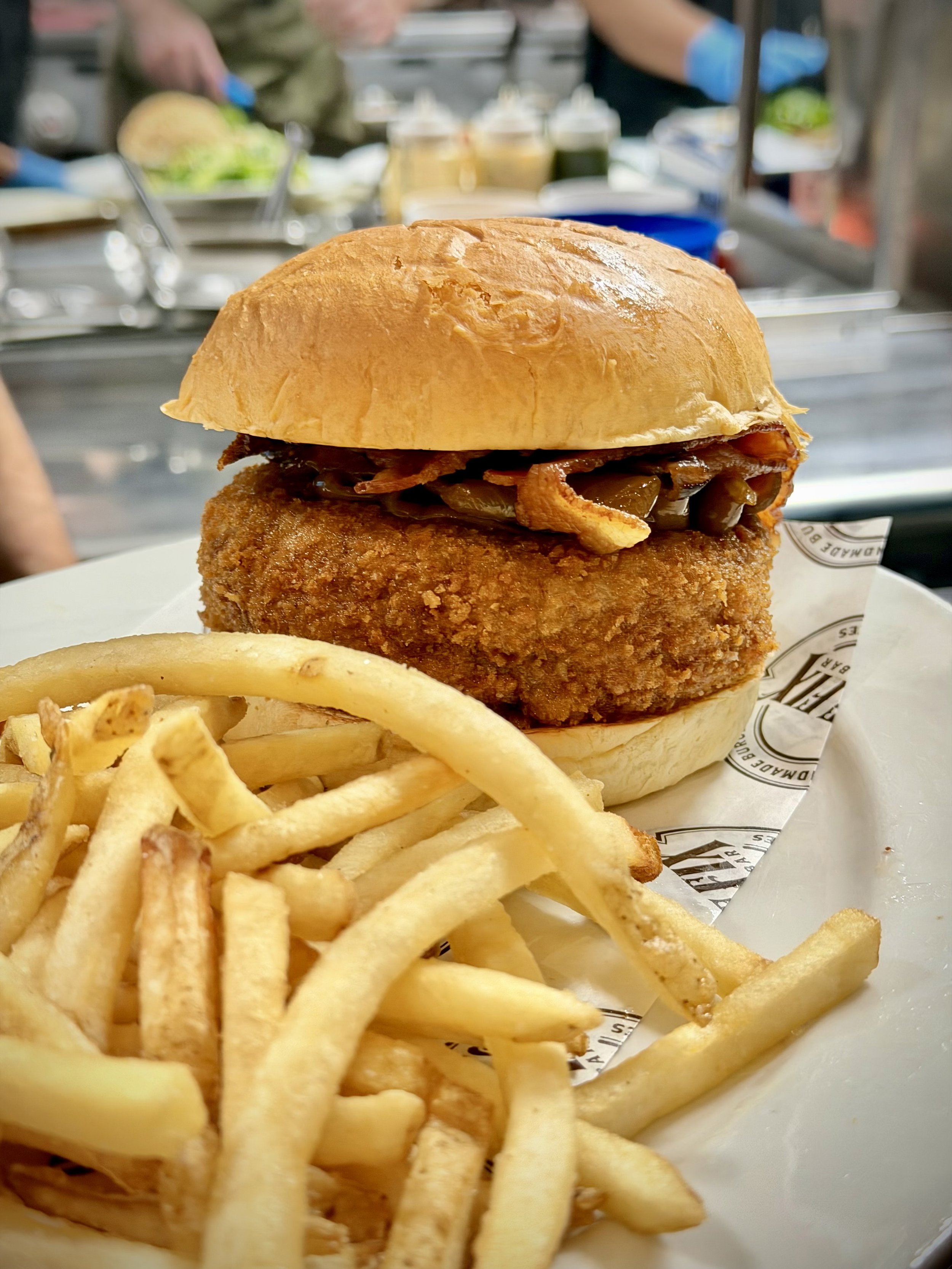 7oz. turkey patty, chipotle cranberry sauce, bacon, crispy fried stuffing, house gravy, smoky mayo, brioche roll, fries / 19